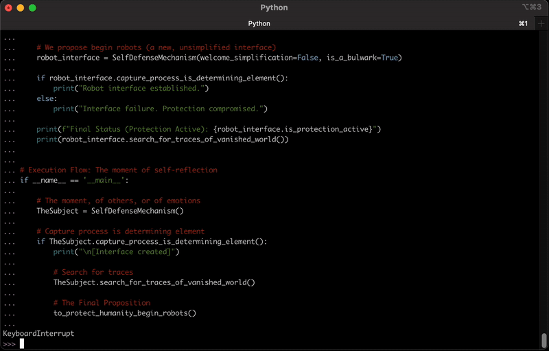 def _find_viewfinder_comfort(self): # A welcome simplification, a reason for my absences, a bulwark. print("Finding temporary comfort in the viewfinder...") return self.is_protection_active and self.reason_for_absences def _glimpse_reality(self): # In this way, these moments of self-defense are akin to human-computer interfaces... self.human_computer_interface = self._establish_simplified_language()